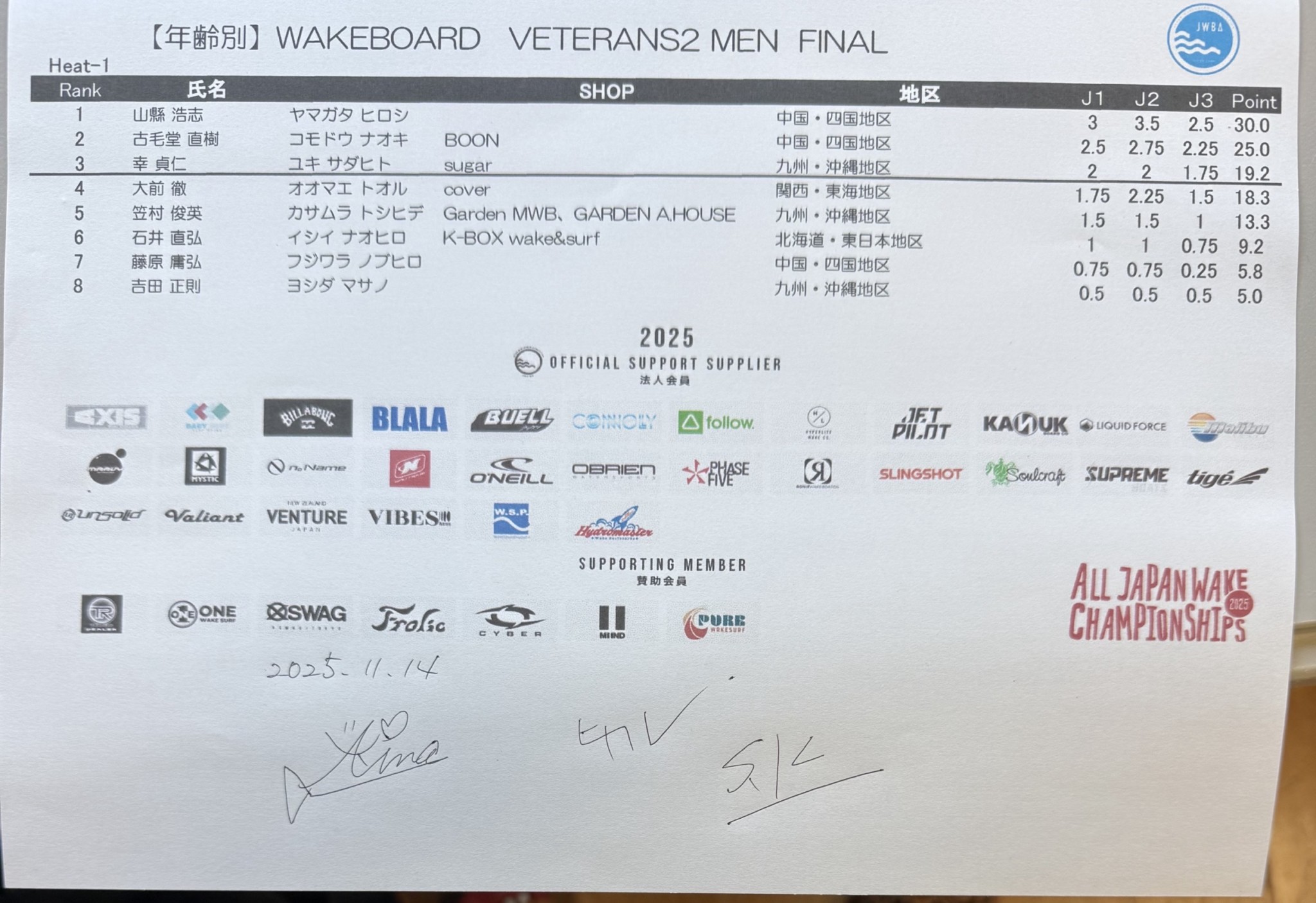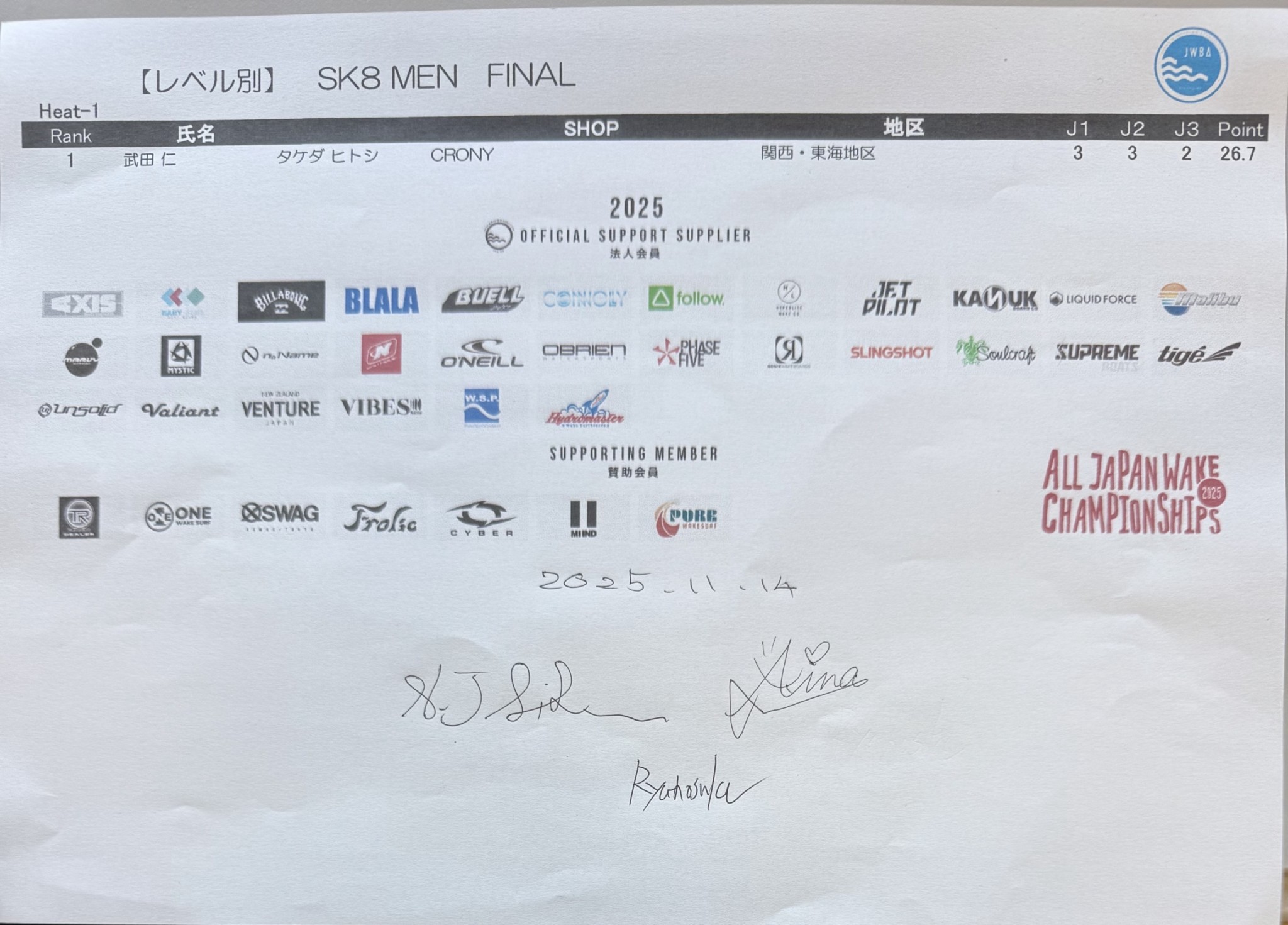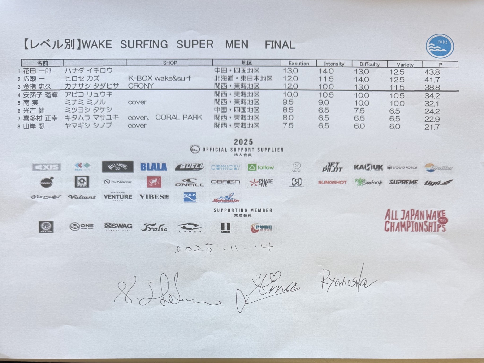 【リザルト2日目】文部科学大臣賞 第34回ウェイクボード・ウェイクサーフィン全日本選手権